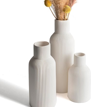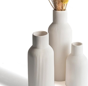 This set of three white ceramic vases features a versatile ribbed or distressed finish, each crafted in varying sizes to create a layered look, they effortlessly elevate any room’s decor—whether styled with faux stems or displayed solo as elegant, minimalist accents.