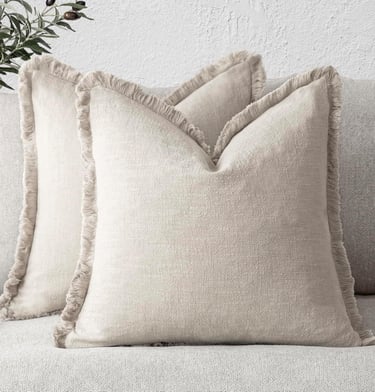 These pillow covers feature a soft, breathable blend of 70% ramie linen and 30% cotton with elegant fringe detailing, they serve as a stylish, durable accent piece—delivering a handcrafted farmhouse aesthetic while using high-quality natural fibres.